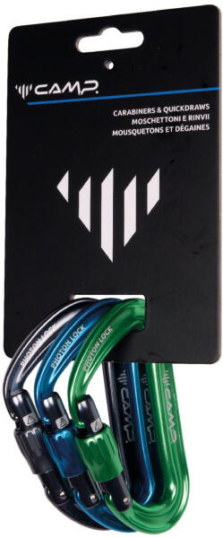 A Camp márkájú Photon Lock háromdarabos „D karabinerkészlet csavaros biztosítással, sokoldalú felhasználásra. A háromdarabos Photon Lock „full size karabinerkészlet csavaros zárbiztosítással rendelkezik. A Photon Lock karabinert sokoldalú felhasználásra tervezték, és minden szintű mászó számára alkalmas. Az I-Beam profilkialakítás kiváló arányt biztosít a szilárdság és a súly között, miközben megőrzi a kötél sima átfutását a karabineren. A Photon Lock karabiner szabadalmaztatott SphereLock orr- és zárkialakítással készül, amely precíz megmunkálás révén növeli a szilárdságot terhelés alatt. Az újonnan továbbfejlesztett csavaros zár biztosítja a menetes rész optimális csúszását, így a karabiner egy kézzel is rendkívül könnyen kezelhető.
